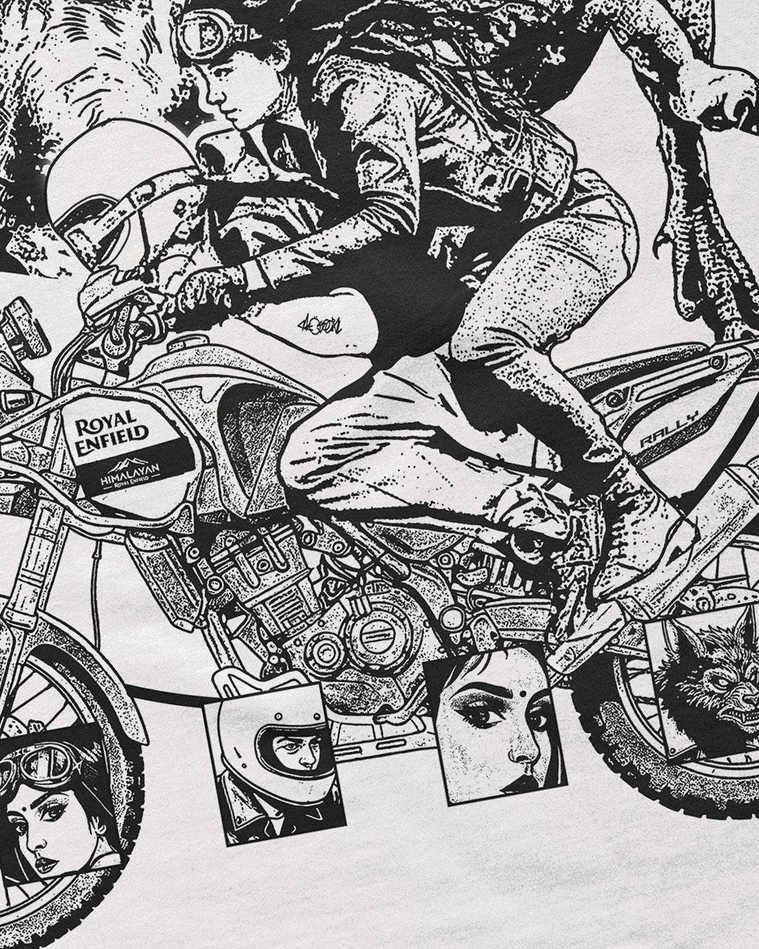 A narrative aesthetic inspired by movie posters, bold compositions, and the silhouette of the legendary Royal Enfield motorcycles